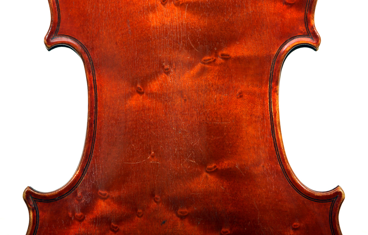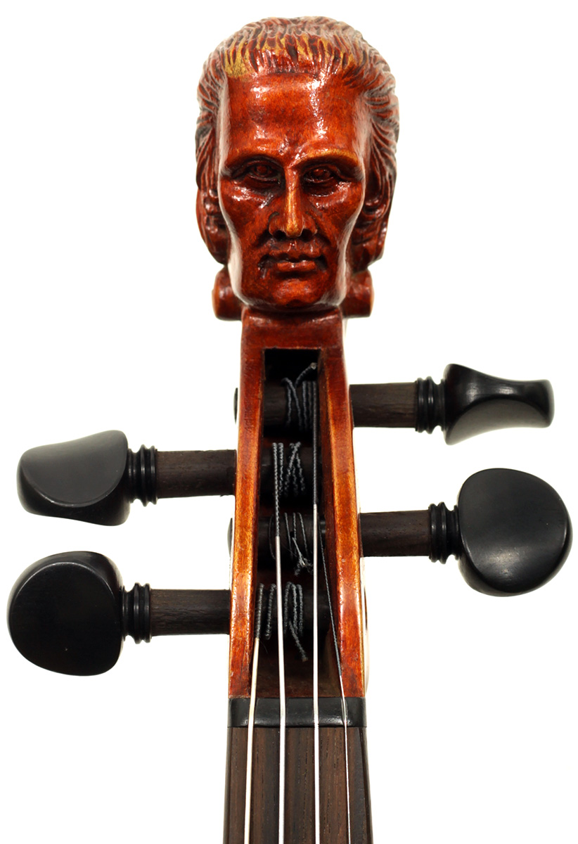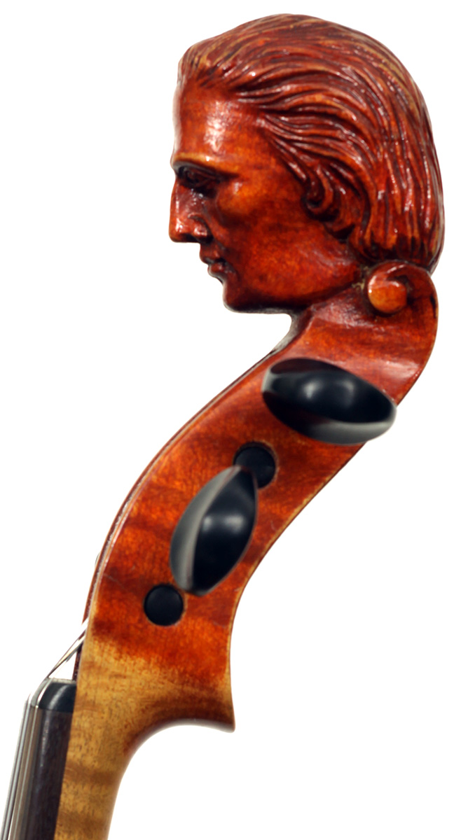 The most striking feature in this instrument is that it has a carved head, instead of a scroll, ostensibly as a tribute to Stradivari. Furthermore, the back and ribs are of attractive bird's eye maple with very distinct motives in the wood, real eye catcher. The top is of very good tone spruce with a very even medium grain throughout. The red-brown varnish is very translucent and compliments the materials well. Workmanship throughout is refined and steady, conforming to high standards.