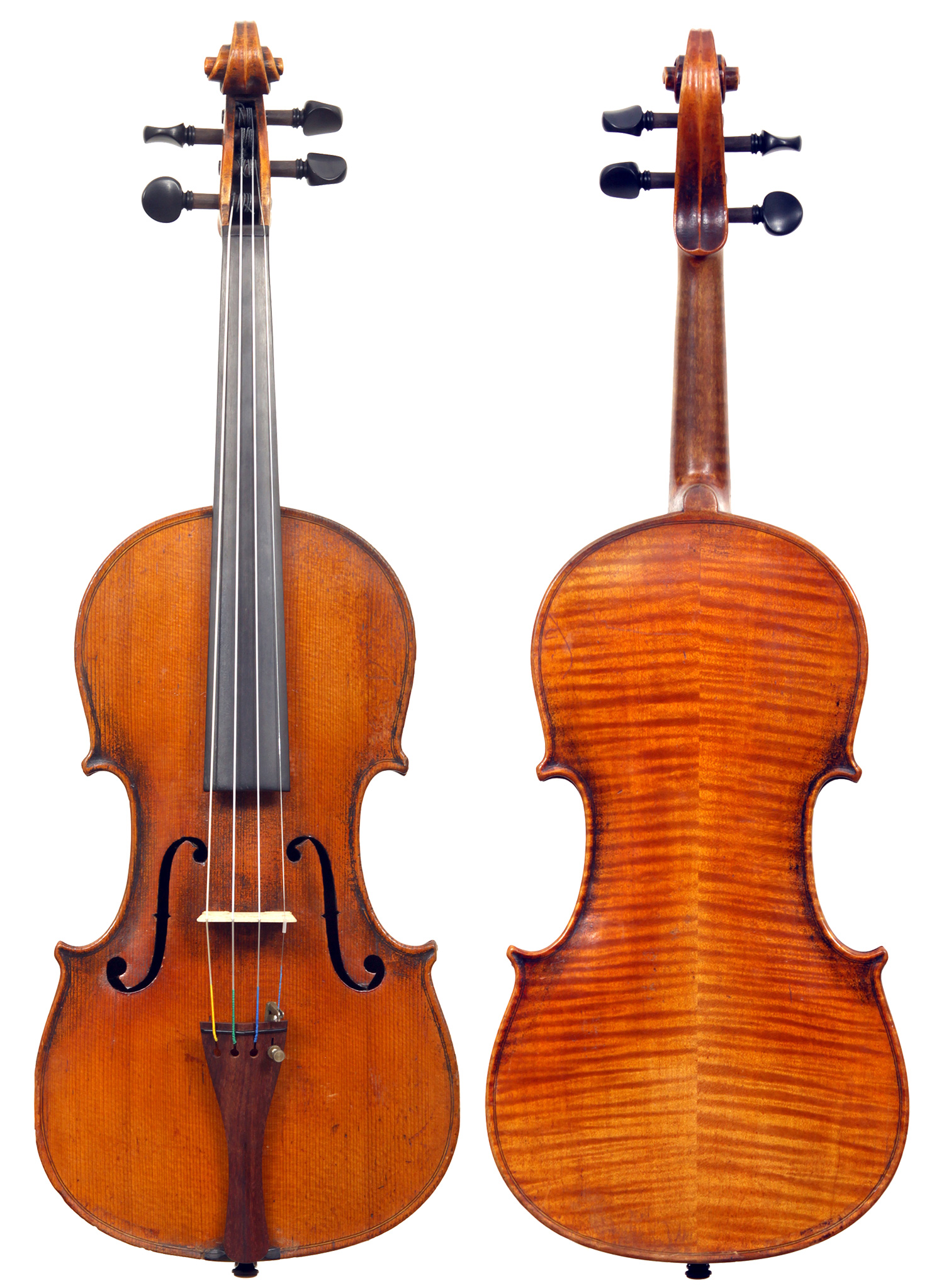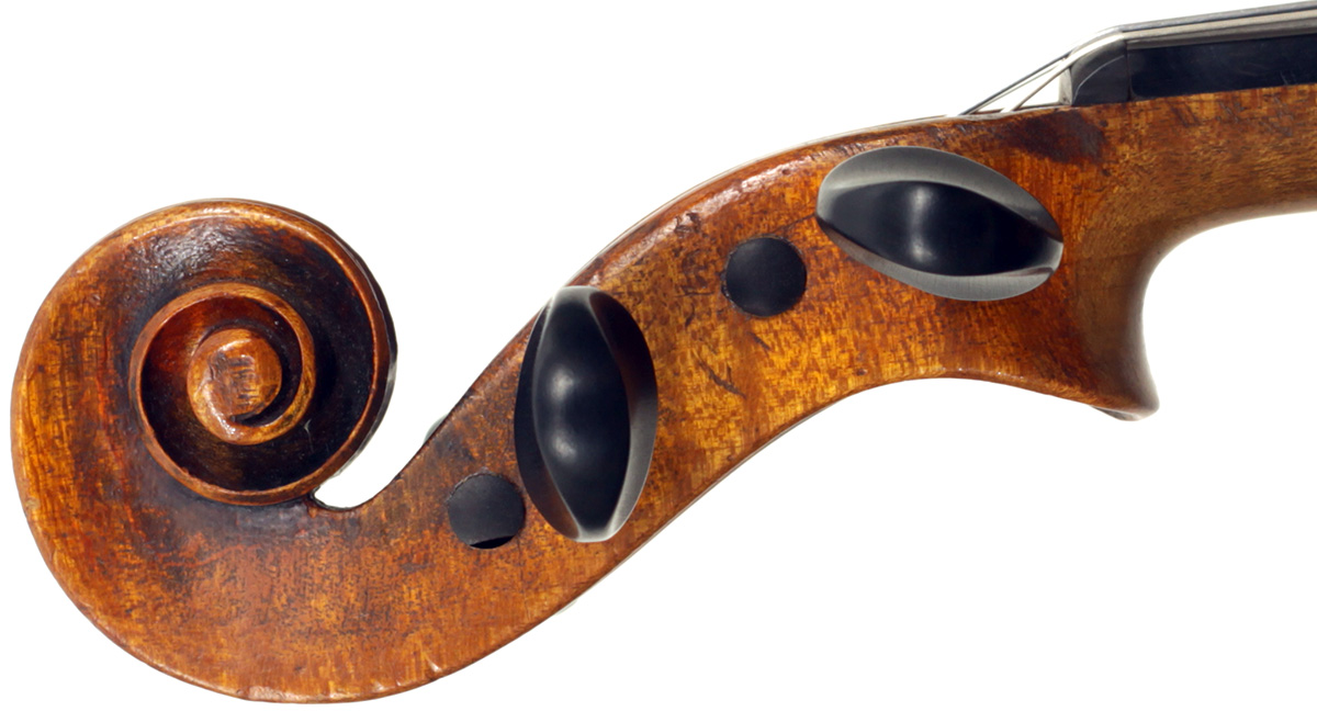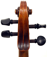 The two piece back, ribs, neck and scroll are of mildly flamed maple. The top is of very good tone spruce with an even medium grain. The Fs and scroll appear somewhat perfunctory but the tracing of the purfling and corner work show an experienced and steady hand. This violin is responsive and easy to play. It would be a suitable intermediate upgrade for a talented student wishing to make progress.