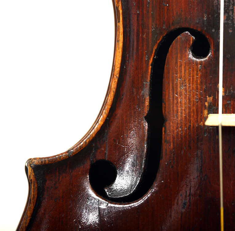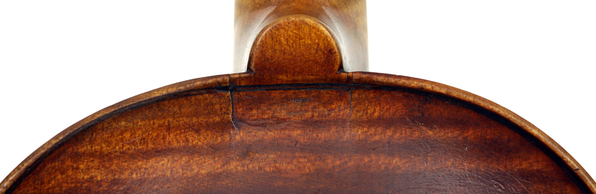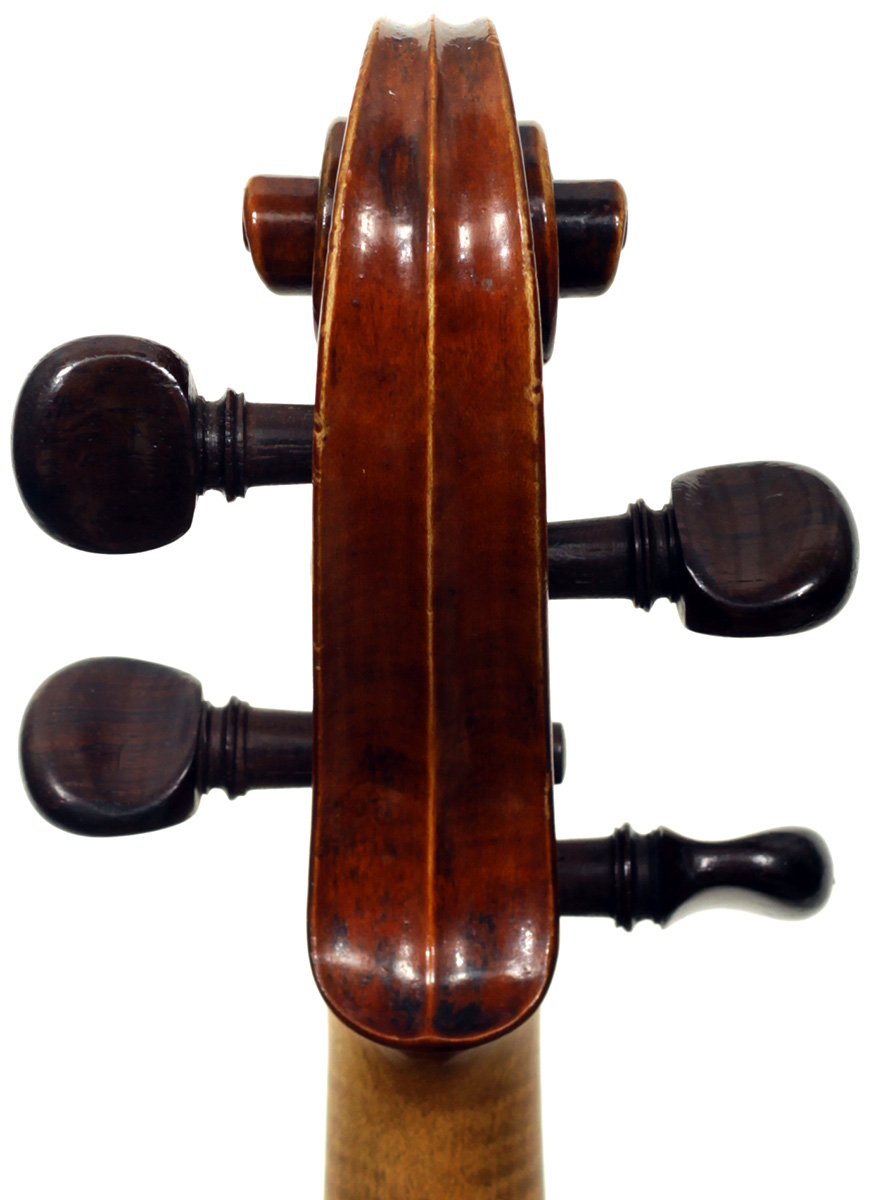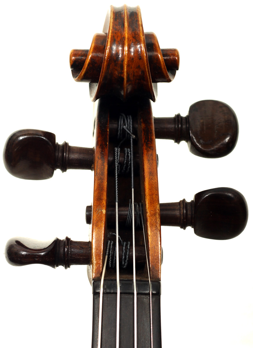 Workmanship in this violin is really good. The one-piece back and the ribs are of nicely flamed maple with a straight medium curl. The neck an scroll use more figured wood and reflect refinement and attention to detail. The scroll is truly elegant and beautifully crafted. The top is of good tone spruce with medium grain at the bass flank narrowing to the treble side.