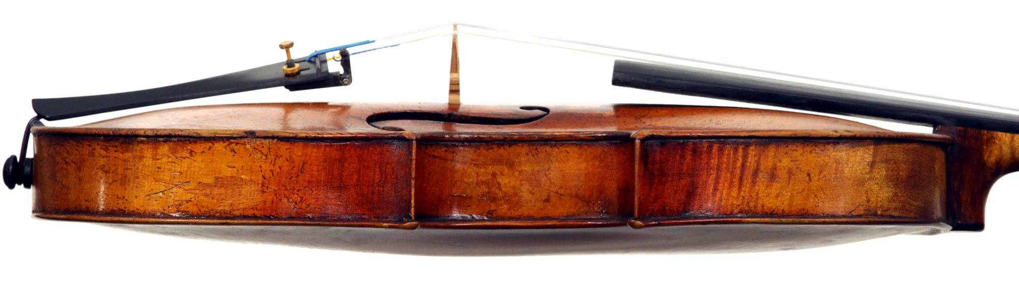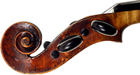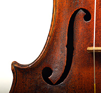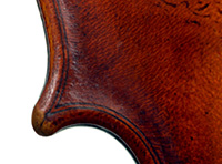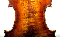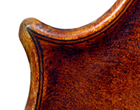 This instrument follows the Stradivari model. Workmanship in this violin is refined throughout. One is impressed by the superb tracing of purfling and cornerwork. The one-piece back clearly is of rather broad curl. The top is of excellent tone spruce, with very narrow grain at the centre line, widening slightly to the flanks. The 6 rib-pieces are unmatched and somewhat plain, except for the two in the upper bout, which are slightly flamed. The oil-based varnish is a nice warm golden colour with a touch of red, over a yellow ground.